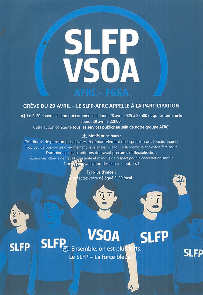 (11/04/25) - Suite à l’obstination du politique, notre groupe SLFP-AFRC appelle à la participation à l’action syndicale du 29 avril.